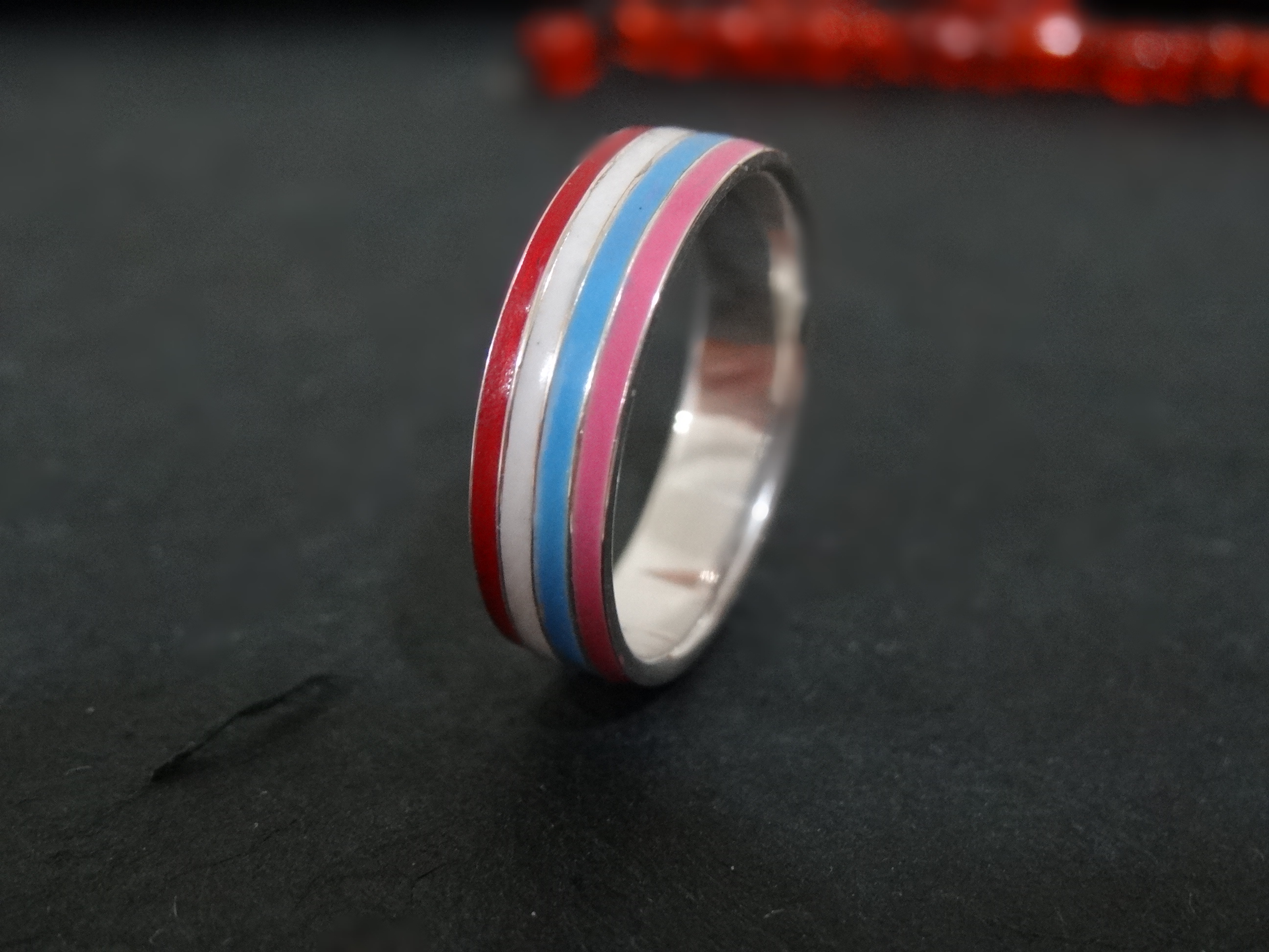 This ring could be filled with the color(s) you like. Our sample ring uses Paris-resemble colors. The base design is a 924 silver ring with four grooves, you see it as the picture above. Different from four color grooves, you can fill with single color, such as pink we show above.