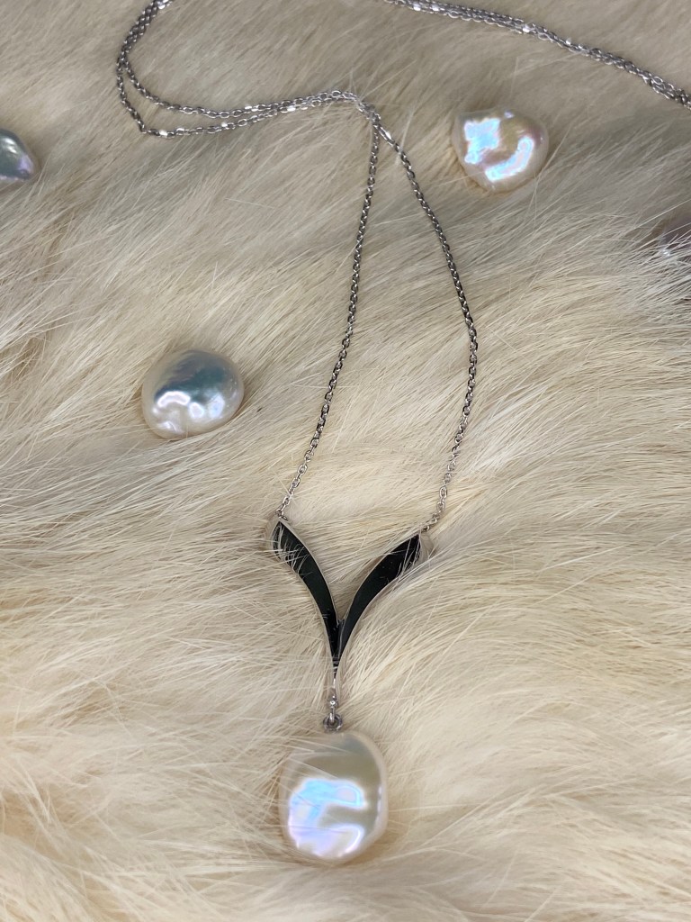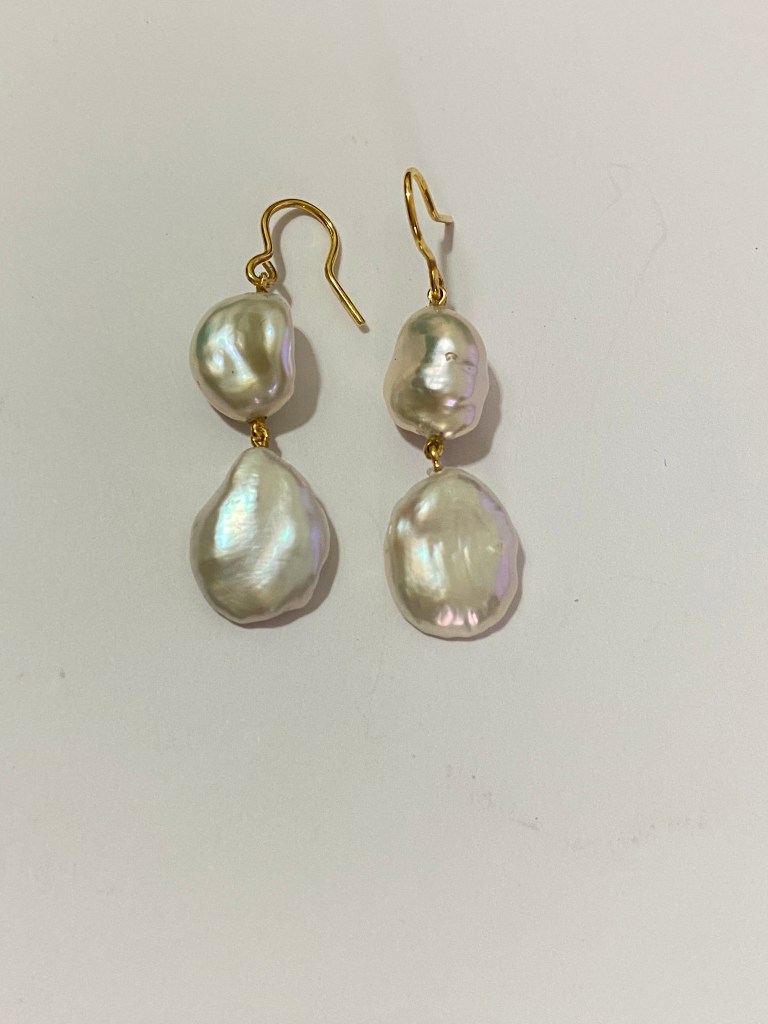 So the first item I made was the single baroque pearl pendant with 10K white gold. One single pearl dangles under a little twisted V curve, simple and beautiful. And then I thought I can design some WFH(work from home) accessories for people to wear while they are on camera for conference calls. Then here comes earrings. I personally always prefer yellow gold so my production team made me this cute pair with 10k yellow gold wire. You probably have noticed that the earrings used two different shape of pearls, one is more like oval shape and another is likely flat. This piece is definitely perfect as WFH jewelry collection and girls with short hair, or those who wear masks but want to have highlight while on camera meetups. Interestingly, I must say though I designed this piece for those who is WFH, however, wearing this earrings reminds me of summer sky, outdoor and ocean.