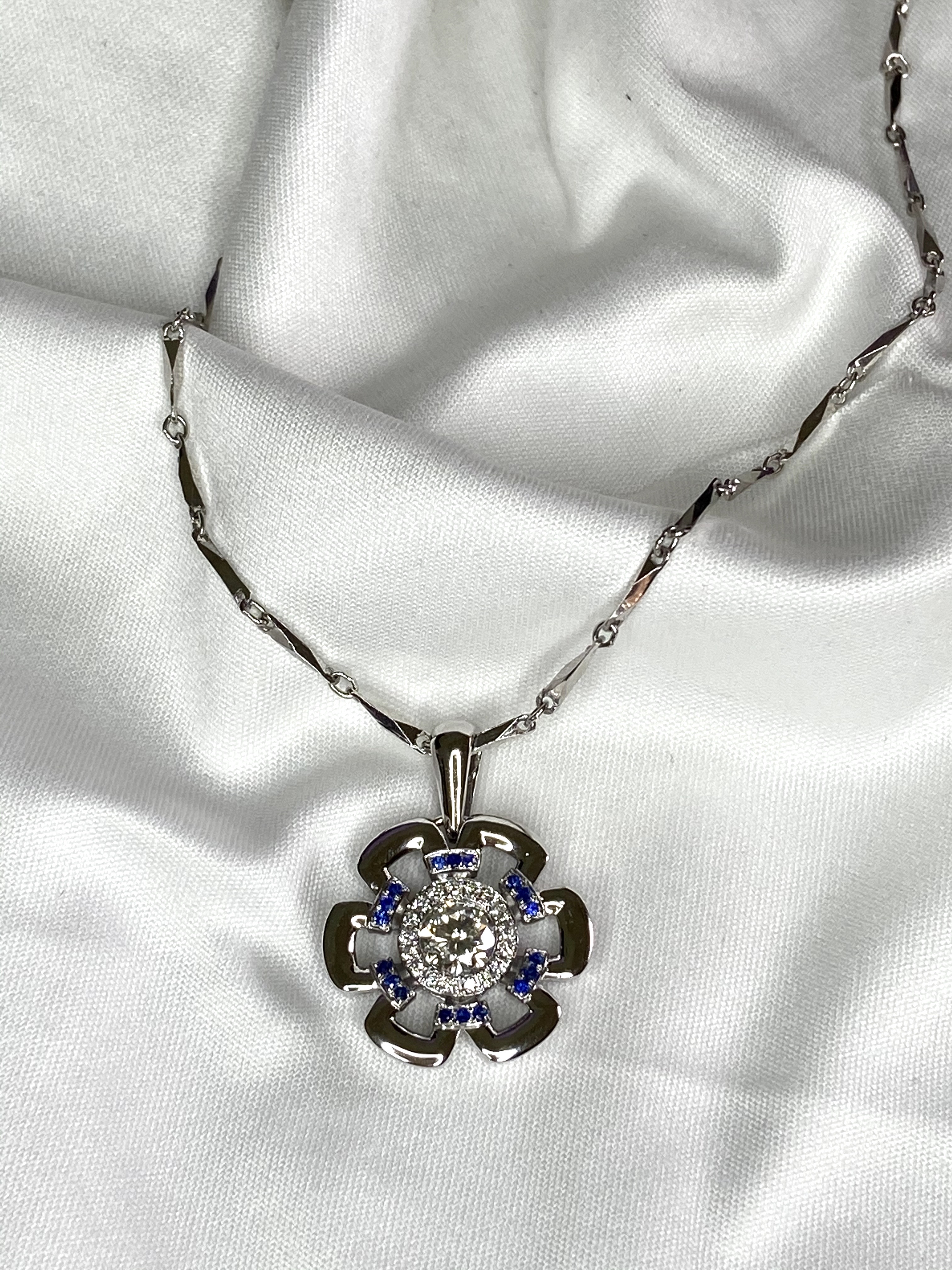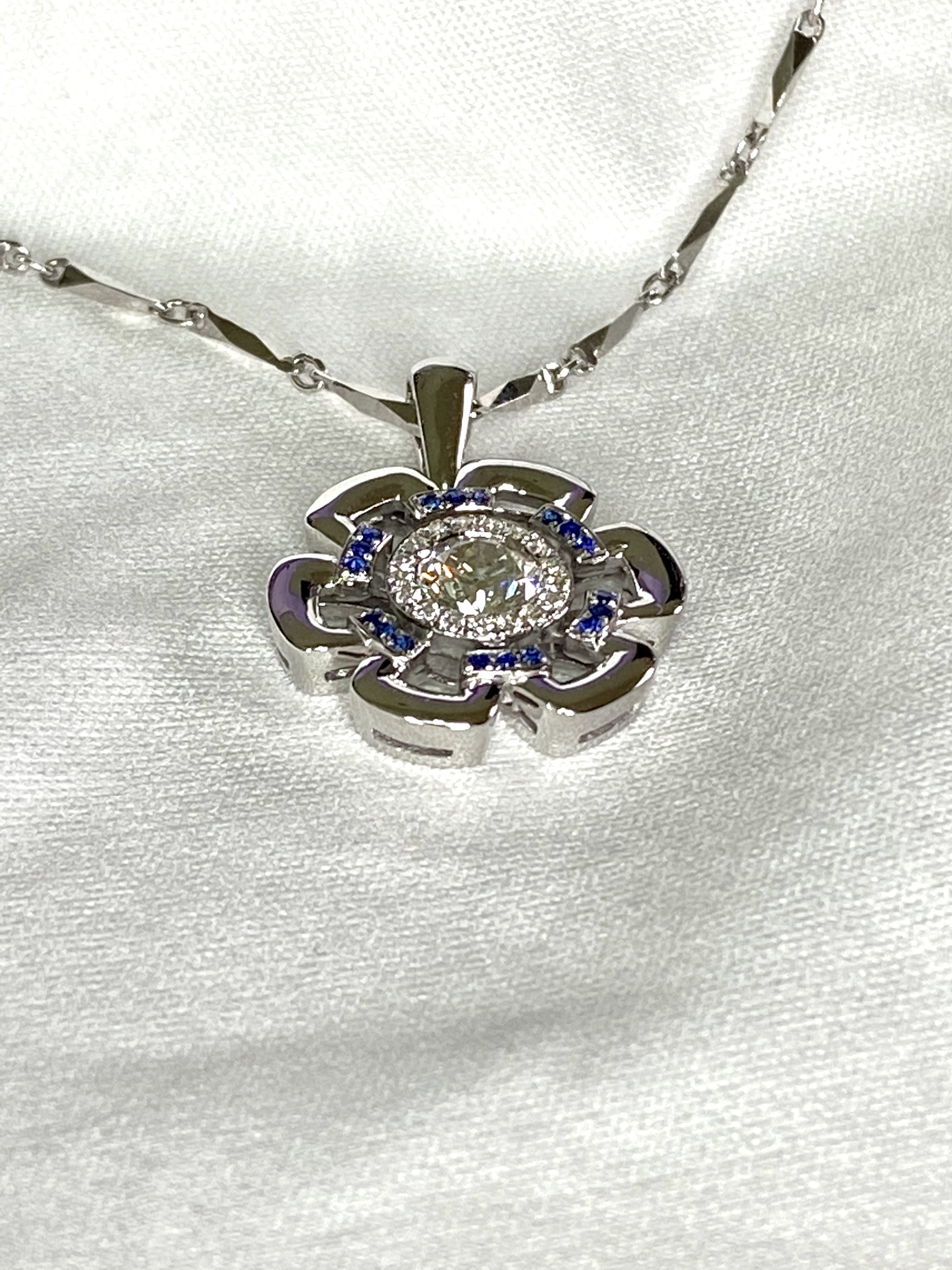 Before remake, the original one was a single 0.5ct diamond pendant, however, diamond size is good enough for any redesign. I decided to make the center stone visually bigger than its real size which is so-called halo style. Floral pattern is always a lovable design and barely go wrong. In this case, we work on the details to enhance its volume and value. Sapphires are cute accent to connect 6 petals.